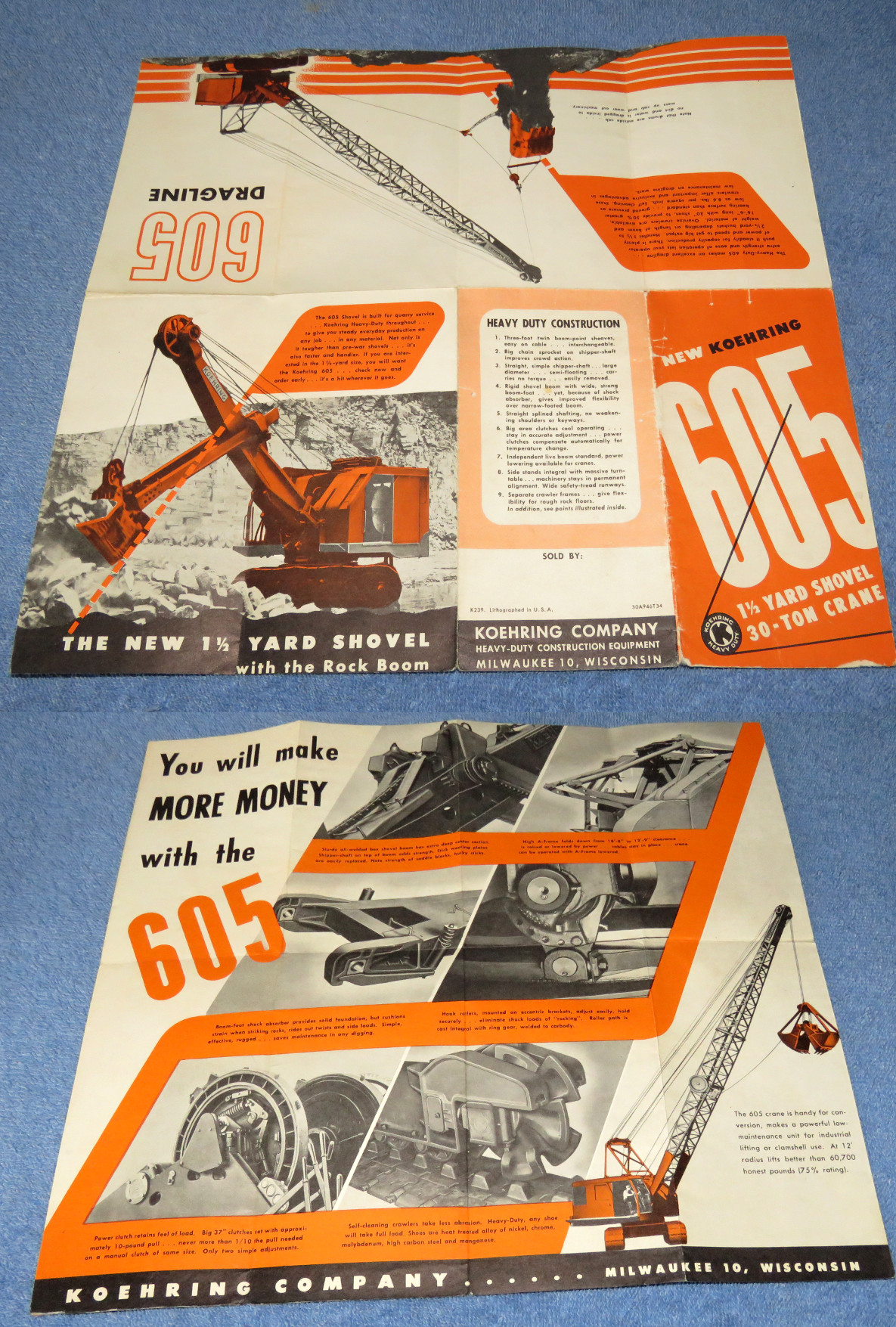 | 17528 | Koehring Company | Koehring 605 Dragline Brochure | Koehring Company | Good. Some shelf wear and creasing. | 12.5 x 12 inch (3 x 6.25 folded) 4 fold brochure ofr the Kowhring 605 1 1/2 Yard Shovel 30-Ton Crane | Automotive, heavy equipment, Koehring Crane | $20 |