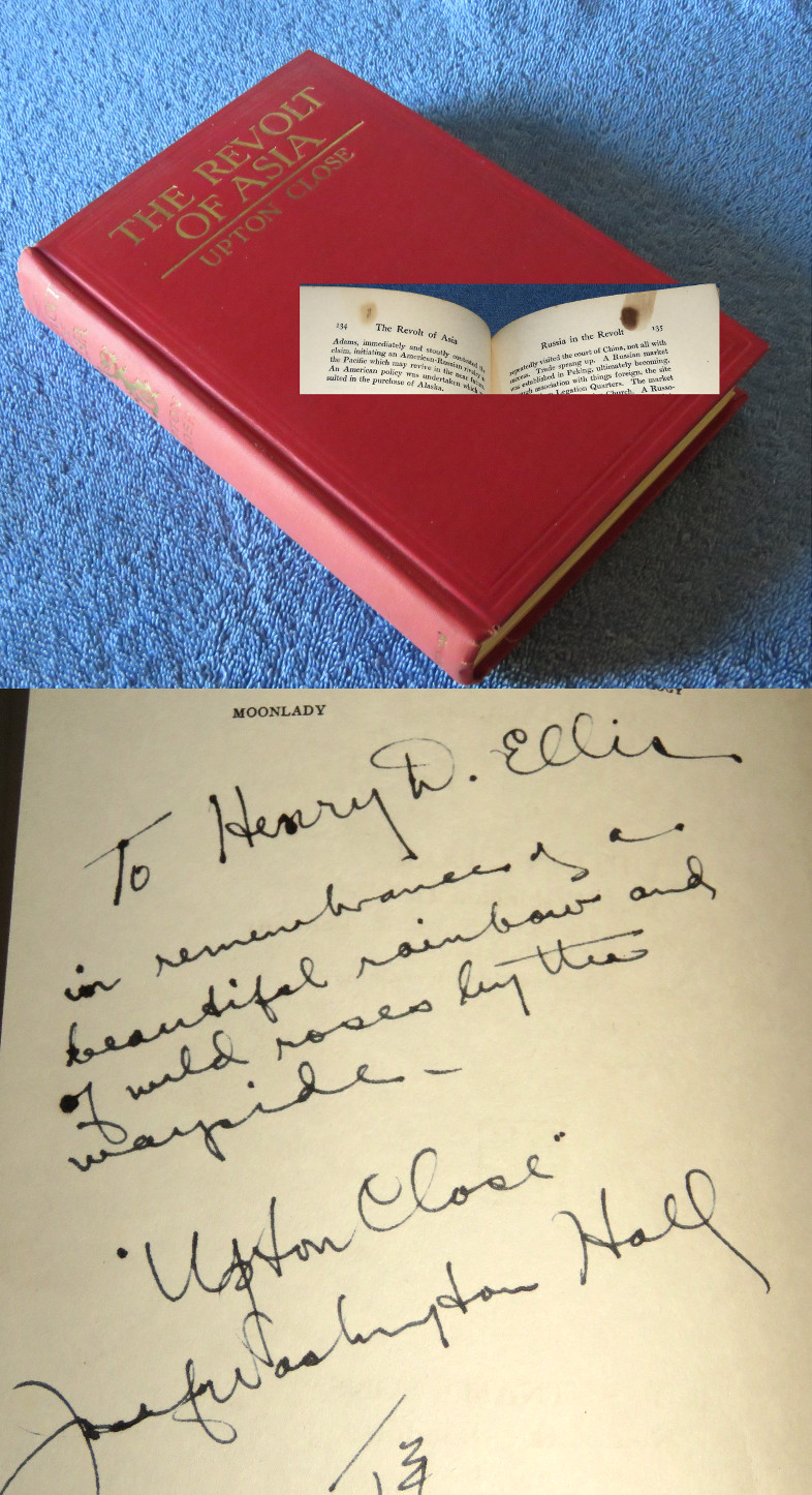 | 17470 | Close, Upton | The Revolt Of Asia | G. P. Putnam's Sons | Good. A stain on the top margins of a few pages. Faint fading on the spine and back cover. No dust wrapper. | The subtitle: "The End of the White Man's World Dominance" There's a multiple line inscription and the author's signature. | Asia, China | $50 |