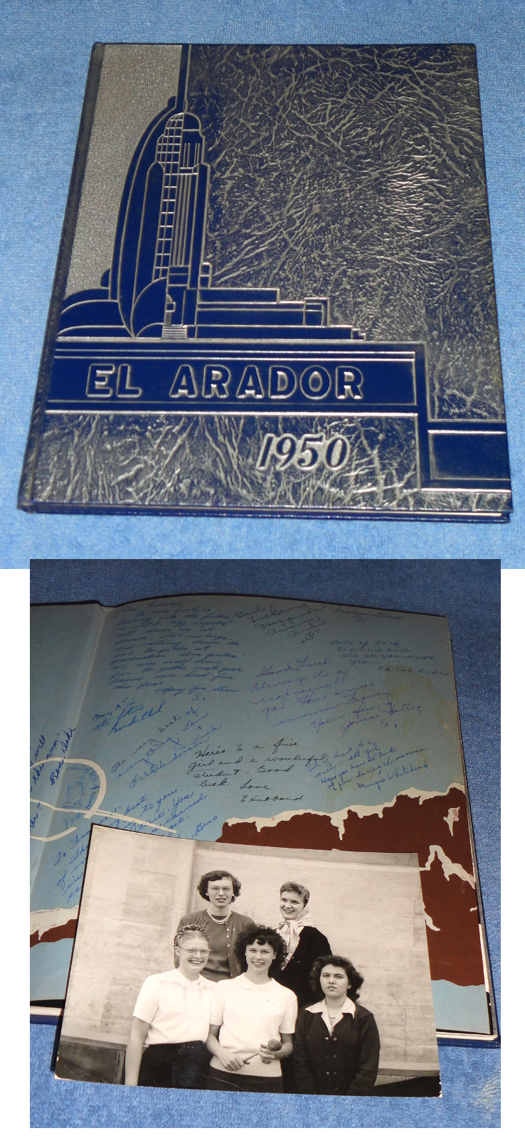 Extensive autographing 9 x 12 inches, Gardena, California High School yearbook for 1950. There are really nice b&w photo ads in back.