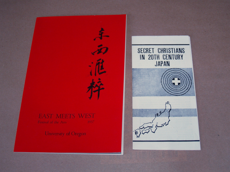 | 17091 | Jessup, Bertram | East Meets West Festival Of The Arts | University of Oregon | Good. Slightly rusty staples | 6 x 9 inch brochure / program for an East Meets West Festival, January 6 to April 5, 1957 at the University of Oregon. Also included is a 3-fold brochure on secret Christians (Catholic) in 20th Century by Professor, P.M. Tagita. Tagita gave a lecture on January 16. | University of Oregon, Aisa, Japan, Kakure Krishtitan, Art | $40 |