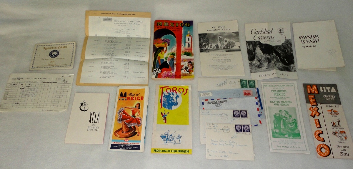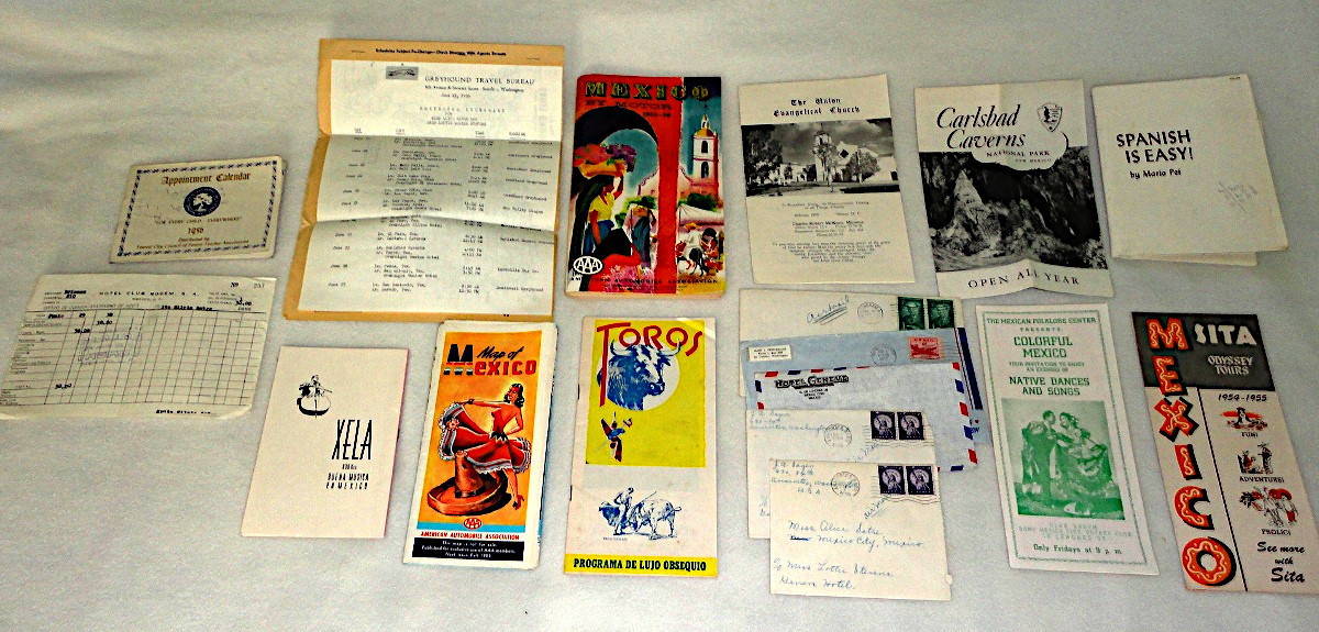 | 12325 | Anon | 1956 Mexico Vacation - Pamphlets and more | Several | Good. Slightly musty. | Two ladies from Seattle take a bus trip to Mexico. Their bus schedule, brochures for a bull fight, church, art centers, a dozen pieces altogether are included. There's the 1956 AAA book for Mexico and other maps. | Mexico, travel, ephemera | $25 |
