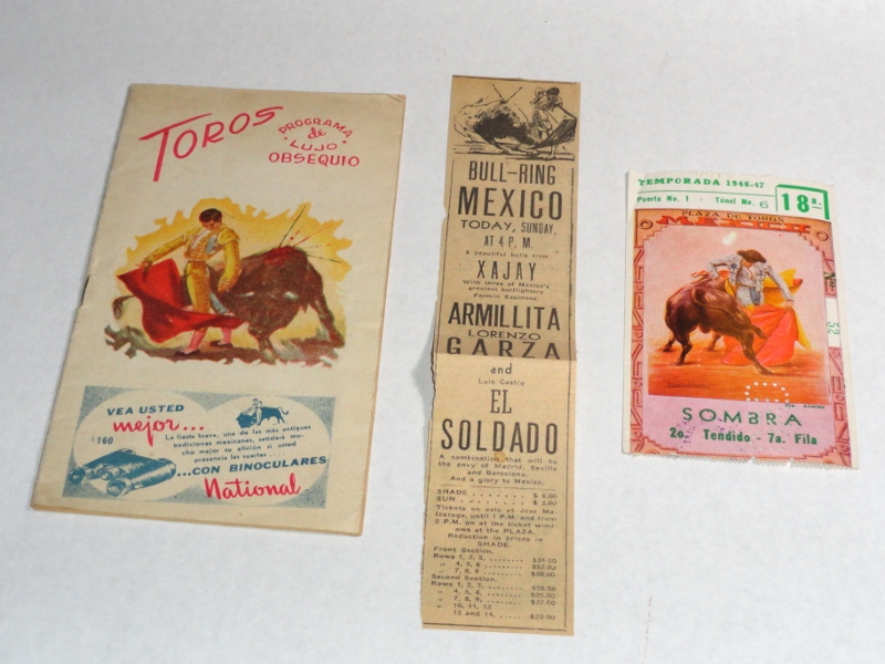 | 15610 | Anon | Toros Programa de "Lujo" Obsequio, ticket and newspaper article | Self-published | Good. Slightly musty. Pages browning. Rusty staple. | 4.5 x 8.75 inches with b&w photos and many ads. Also included is a ticket to a bullfight and a newspaper article, all in Spanish. | Mexico, Bullfighting, ephemera. | $20 |