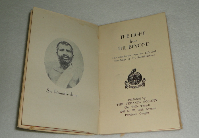 | 12139 | Ramakrishna, Sri | The Light From Beyond | The Vedanta Society The Vedic Temple, 1206 N. W. 25th Avenue, Portland, Oregon | Fair. The covers have moisture stains and chipping. There's glue soak through on the inside flaps and the staples are rusty. | 3.75 x 6 inches, this small book is "An adaptation from the Life and Teachings of Sri Ramakrishna." This copy was printed by the Vedanta Society in Portland, Oregon, and has a photo frontis picture of Sri Ramakrishna | Religion, Hindu, Sri Ramakrishna, Portland, Oregon | $20 |