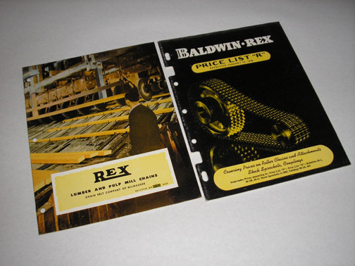 | 11003 | Chain Belt Company | Rex Lumber and Pulp Mill Chains Bulletin No. 50-26 | Chain Belt Company of Milwaukee | Very good with light soiling on the back cover. Has rusty staples. | Circa 1950 stapled paperback, 8.5 x 11 inches, with 23 pages and b&w photos. Also comes with Baldwin Rex Price List R. | Trade Catalog, Chain Belt, Chain Belt Company, Baldwin Rex | $20 |