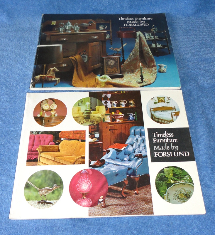 | 17329 | Carl Forslund, Inc. | Timeless Furniture Made by Forslund, 2 catalogs, 1970 and 1973 | Carl Forslund, Inc. | Good. The 1970 edition has wear on the top and bottom of the spine. | 11 x 8..5 with many color photos of furniture of the time. | Trade catalogs, furniture | $20 |