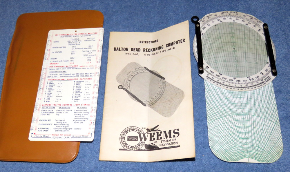 | 17740 | Weems | Dalton Dead Reckoning Computer Tiype E-6B E-10 (USAF Type MB-4) Instructions, Computer and Chevron Flight Guide | Weems | Good. The instructions have a sharp vertical crease and some soiling. | Dalton Dead Reckoning Computer Tiype E-6B E-10 (USAF Type MB-4) Instructions, Computer with case and plastic Chevron Flight Guide | Dalton Dead Reckoning, Aviation, ephemera | $40 |