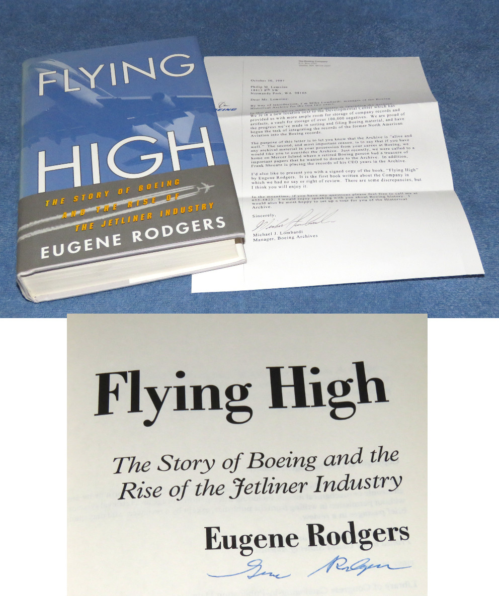 | 17770 | Rodgers, Eugene | Flying High The Story Of Boeing And The Rise Of The Jetliner Industry | The Atlantic Monthly Press | Very good. In a very good dust wrapper. | Signed by the author. There are many photos, bibliography and index. Also a signed letter from Boeing Archives mgr. Michael J. Lombardi soliciting materals for the archive. | Aviation, Boeing, Corporate history | $30 |