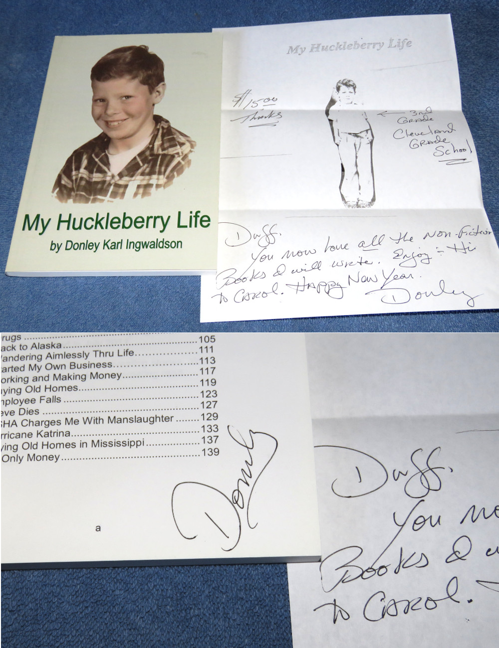 | 17624 | Ingwaldson, Donley Karl | My Huckleberry Life | Self-published | Very good. | Signed by the author. There's also a personal 1 page letter/receipt. Autobiography. Vietnam War, Northwest Airlines. There are many b&w photos. | Autobiography, Vietnam War, Northwest Airlines, Aviation | $40 |