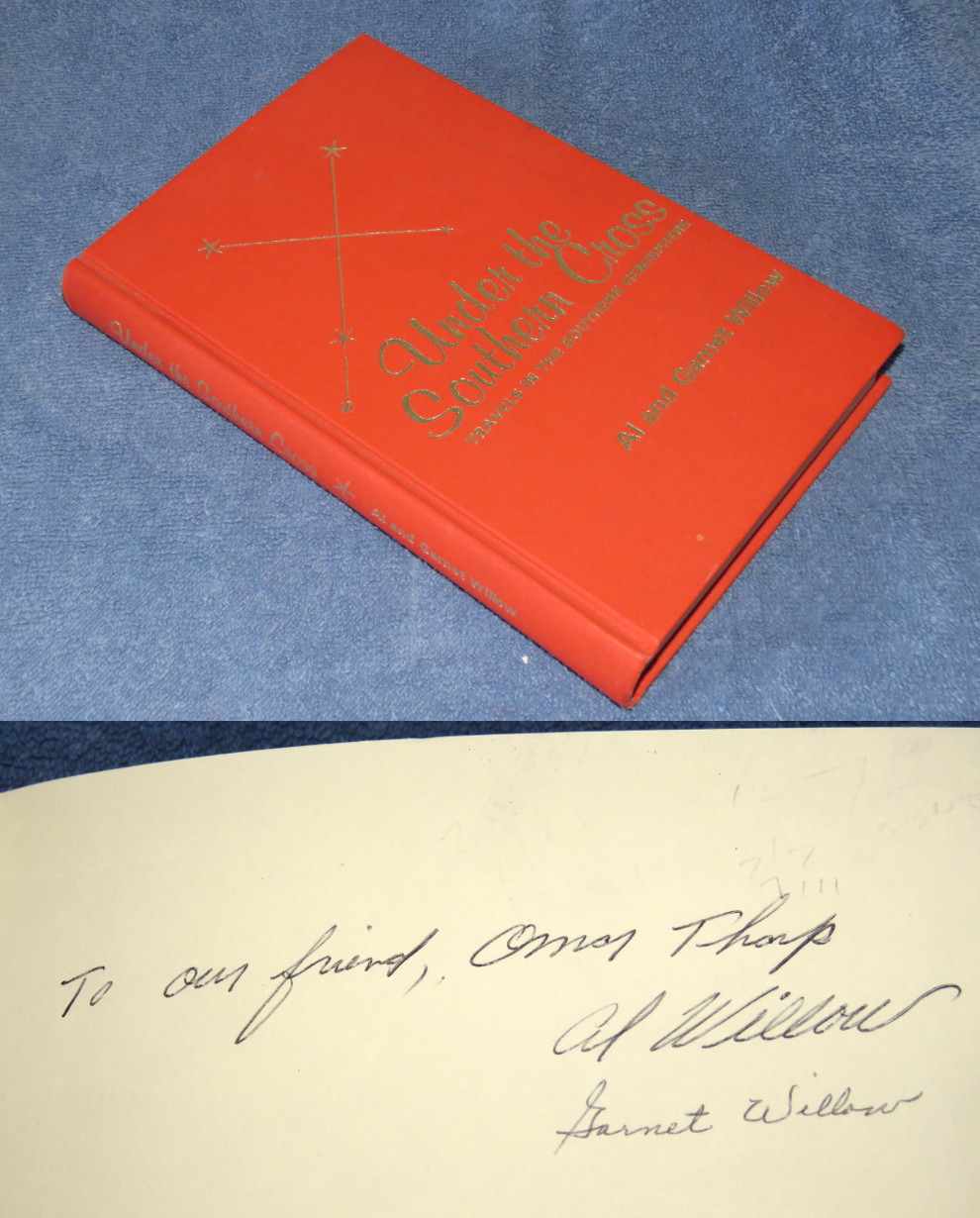 | 17721 | Willow, Al and Garnet | Under The Southern Cross Travels in the Southern Hemisphere | Harlo | Good. Veriy occasional red underlining. No dust wrapper. | Inscribed to our friend.....signed by both authors. Travel by air? To Hawaii, Samoa, New Zealand, Australia, South Africa, Kenya, Egypt, Greece Israel and England. | Travel, Hawaii, Samoa, New Zealand, Australia, South Africa, Kenya, Egypt, Greece and Israel | $30 |
