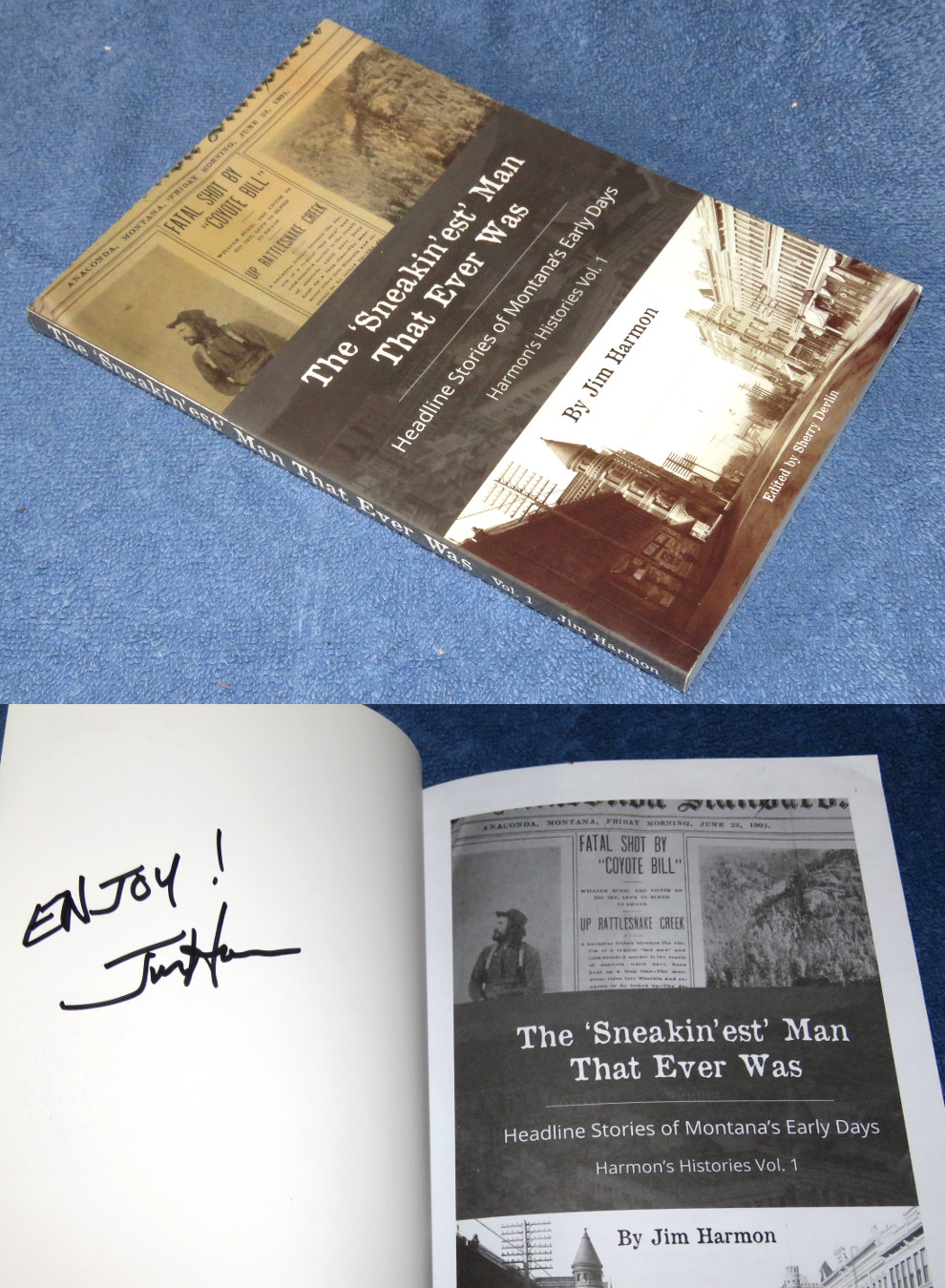 | 17644 | Harmon, Jim | The 'Sneakin'est' Man That Ever Was Headline Stories of Montana's Early Days | Stonydale Press Publishing Company | Very good. Faint shelf wear. | Stories from Montana's history. There are many b&w photos. The author signature is on the inside of the front cover. | Montana | $30 |