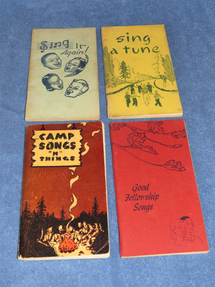 | 17752 | Zander, Carl E., Wes H. Klushmann, The Methodist Church | Four Different Camp Song books, 4 x 7 inches | The Methodist Church, Cooperative Recreation Service, Songs 'N' Things | Good. All have light soiling, like they were used abound a campfire? | Song books to use around a group campfire. Patriotic, religious and more. | Music, Ephemera, camp song books | $25 |