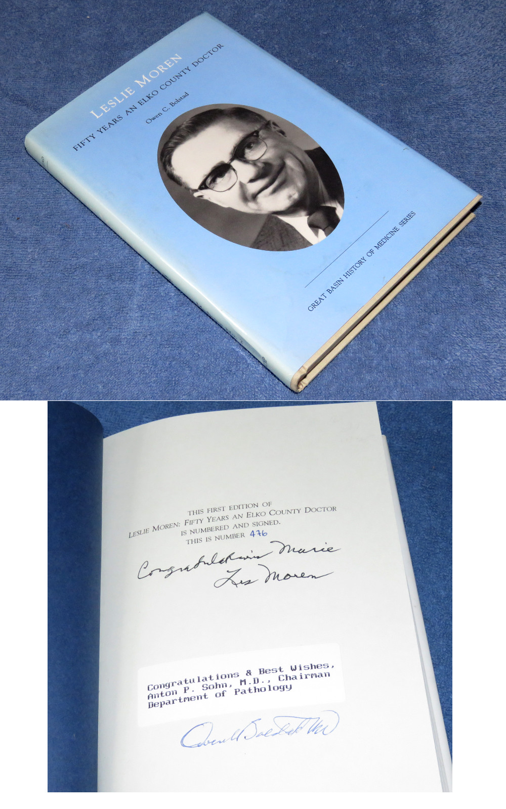 | 17653 | Bolstad, Owen C. | Leslie Moren Fifty Years An Elko Country Doctor | University of Nevada | Good. Faint small brown stain on the bottom inside of the pages. In a dust wrapper with a brown stain at the bottom of the spine. | This is copy # 476, with a signature by Moren and Dr. Anton P. Sohn, Chairman Department of Pathology. | Medicine, Nevada, Elko | $25 |